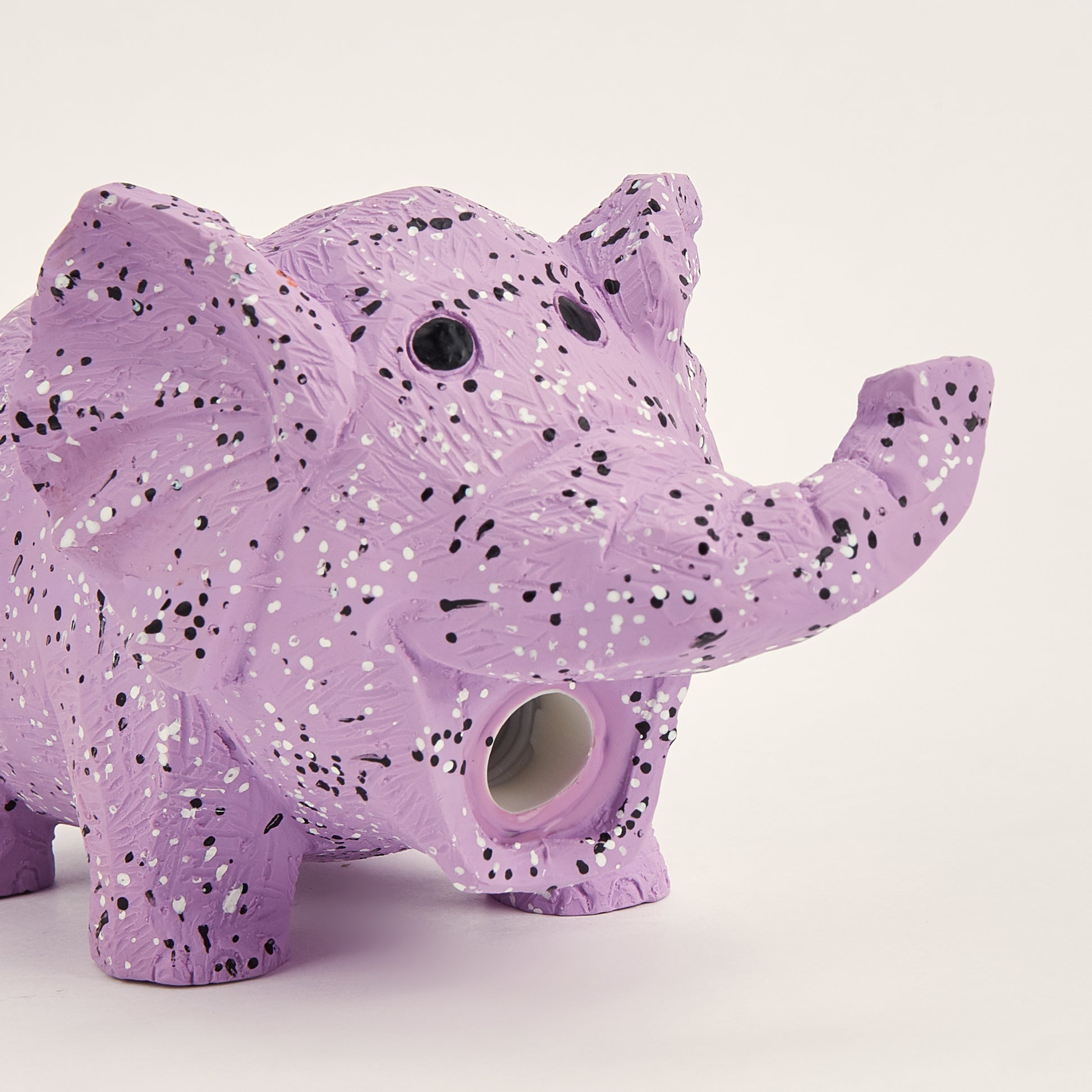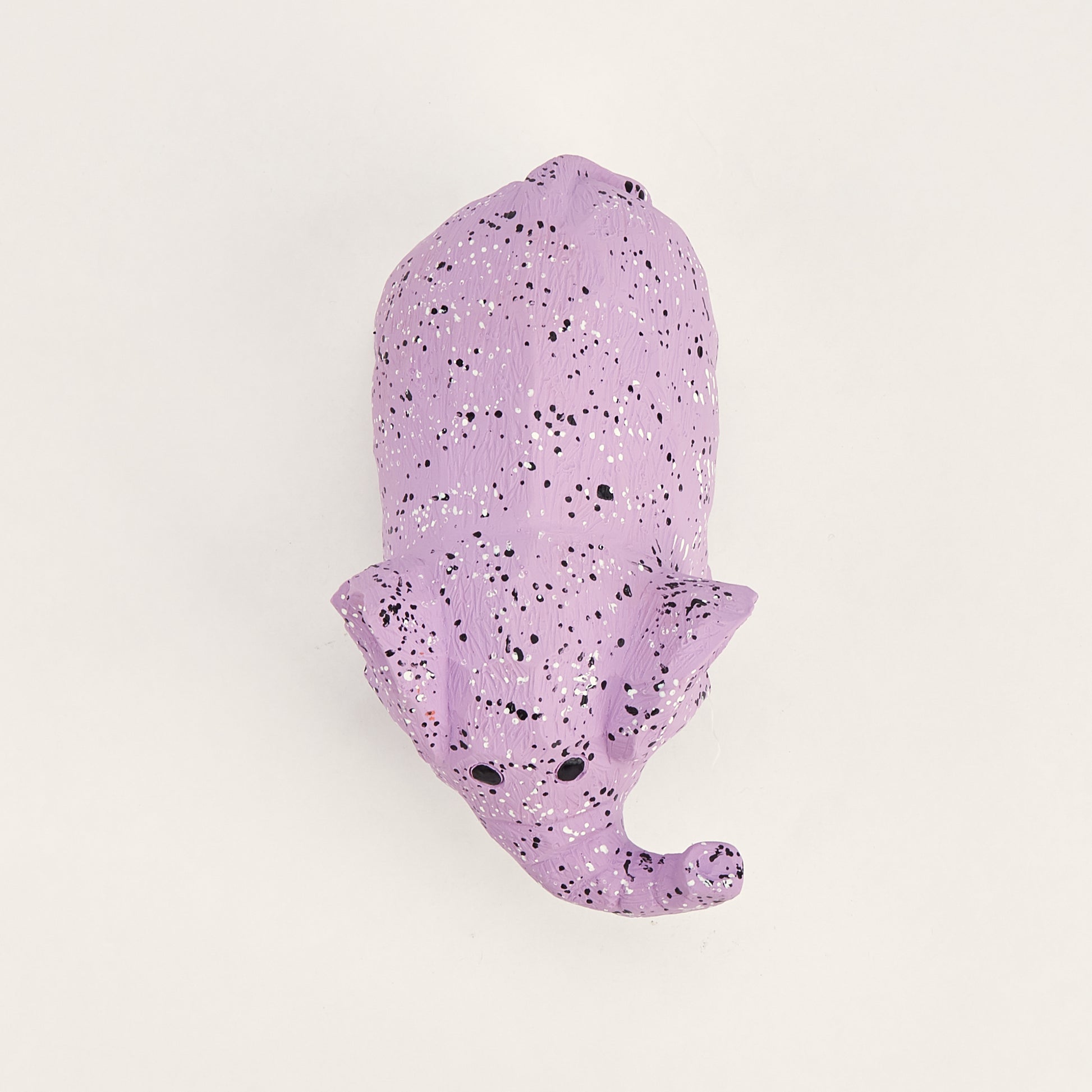 Com um charme rústico que imita perfeitamente a textura e os detalhes de uma escultura em madeira artesanal, este brinquedo é, na verdade, feito de latex resistente e de alta qualidade. Seu corpo roxo é pontilhado com divertidas pintas brancas e pretas, dando um toque de alegria e personalidade.