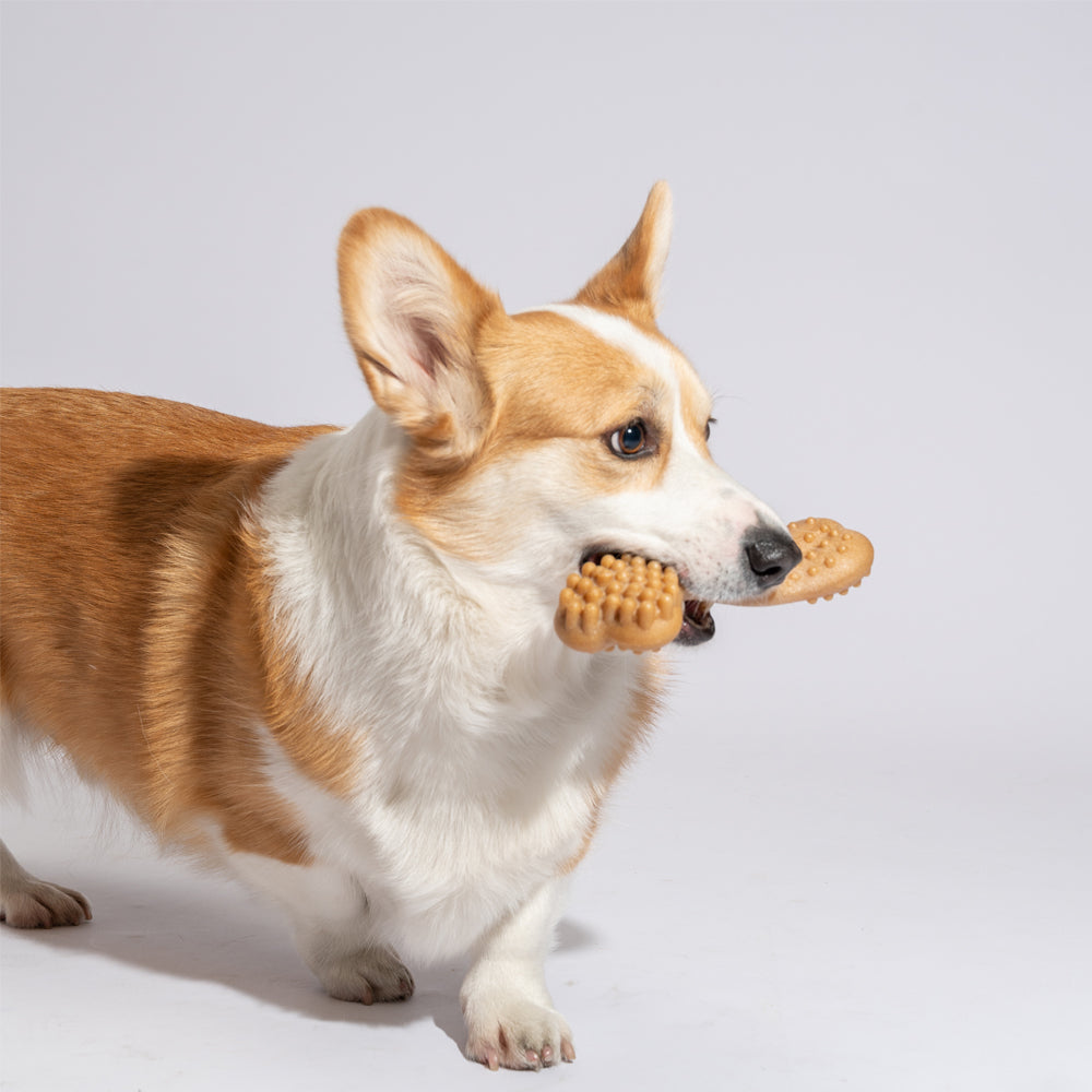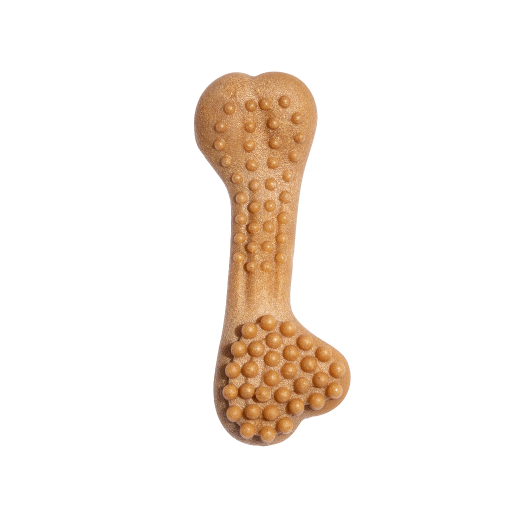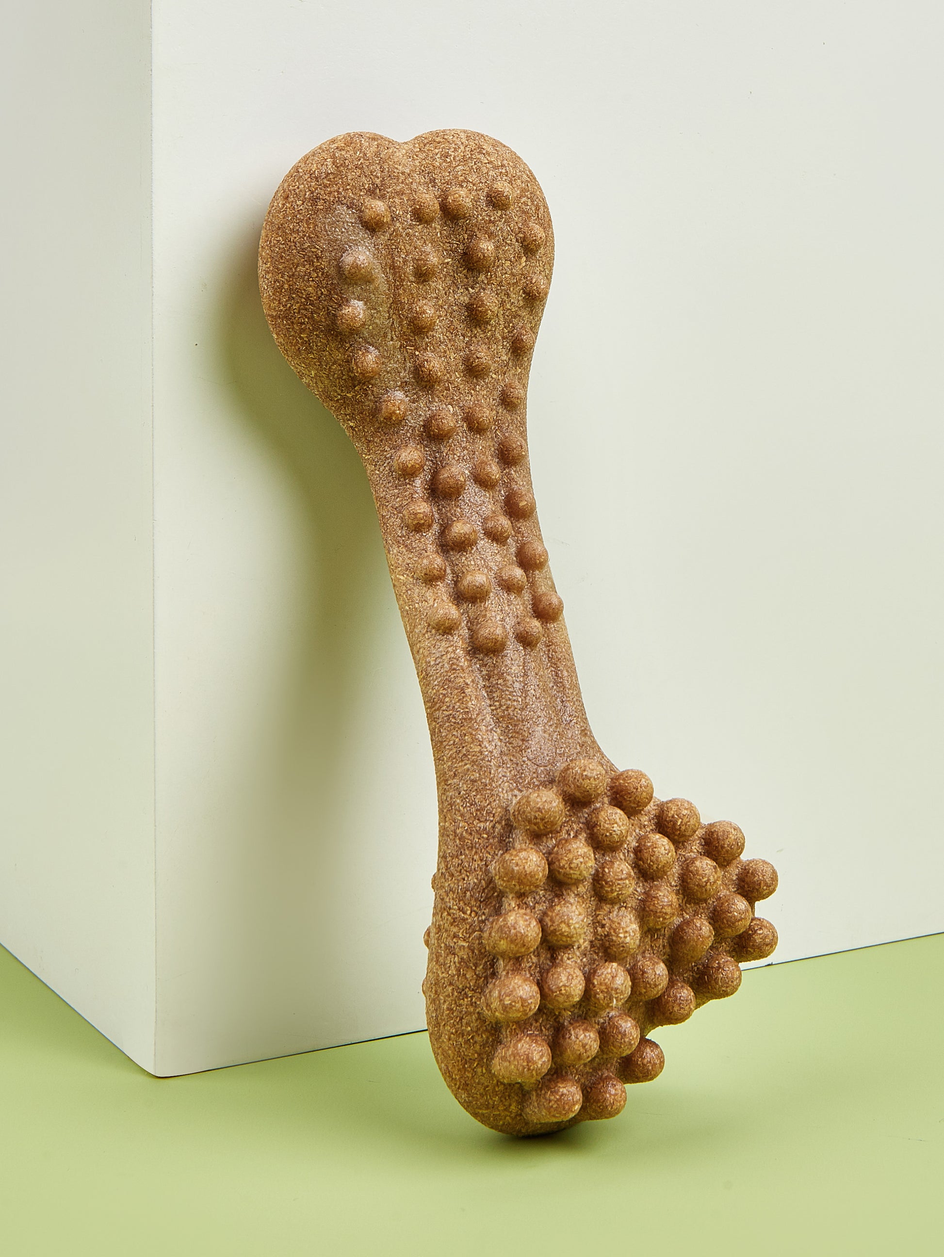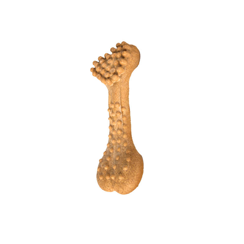Todo o design é arredondado, sem pontas ou quinas, garantindo uma mastigação firme, mas totalmente segura. A superfície possui texturas naturais que trazem mais variedade e interesse para a boca do cão, tornando a brincadeira ainda mais gostosa.