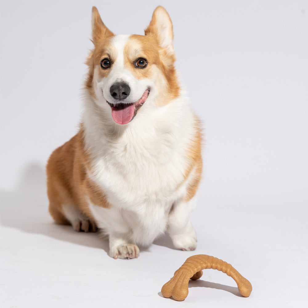 Todo o design é arredondado, sem pontas ou quinas, garantindo uma mastigação firme, mas totalmente segura. A superfície possui texturas naturais que trazem mais variedade e interesse para a boca do cão, tornando a brincadeira ainda mais gostosa.
